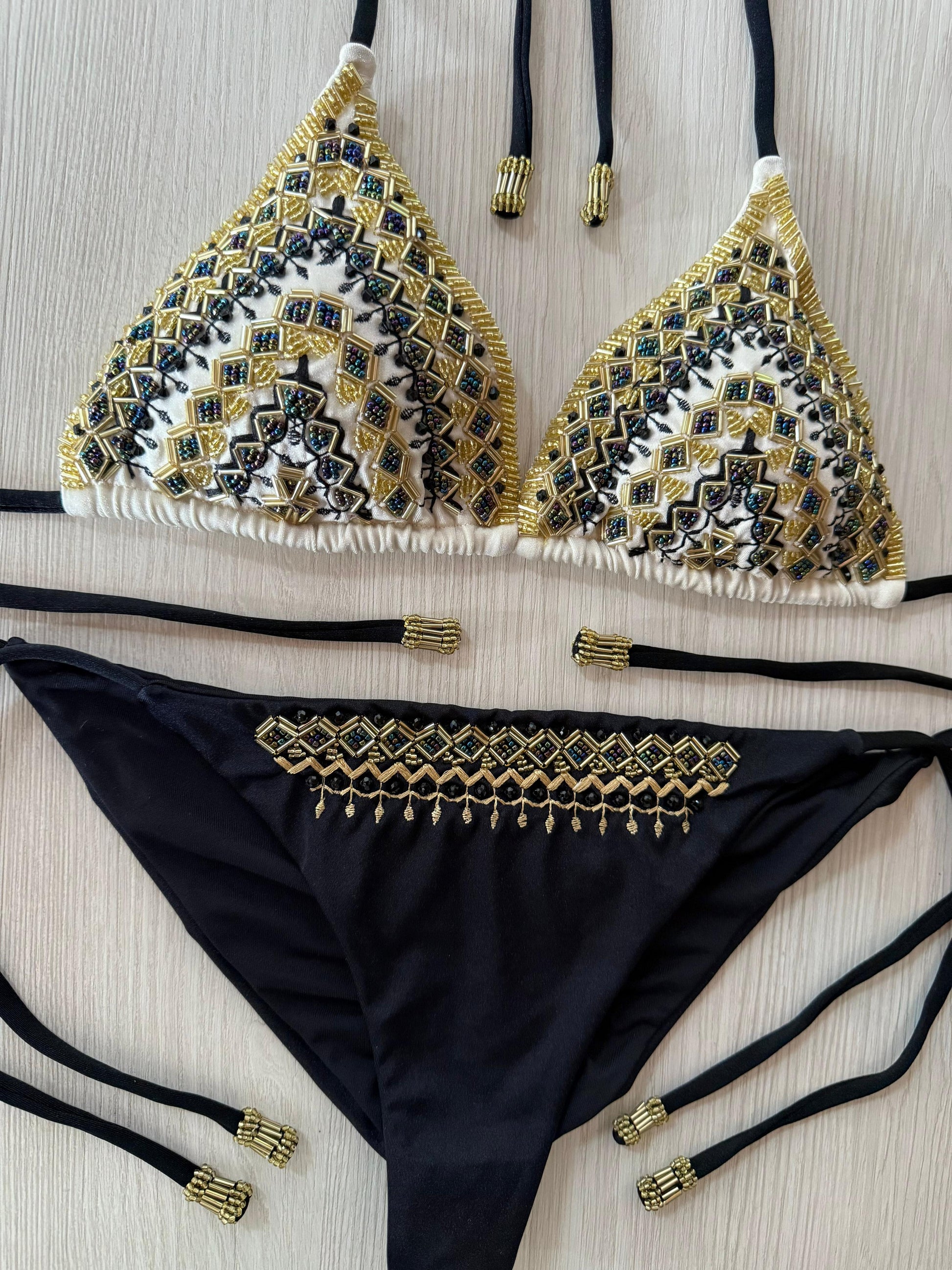 Bikini con detalles de pedrería en panty y top.
